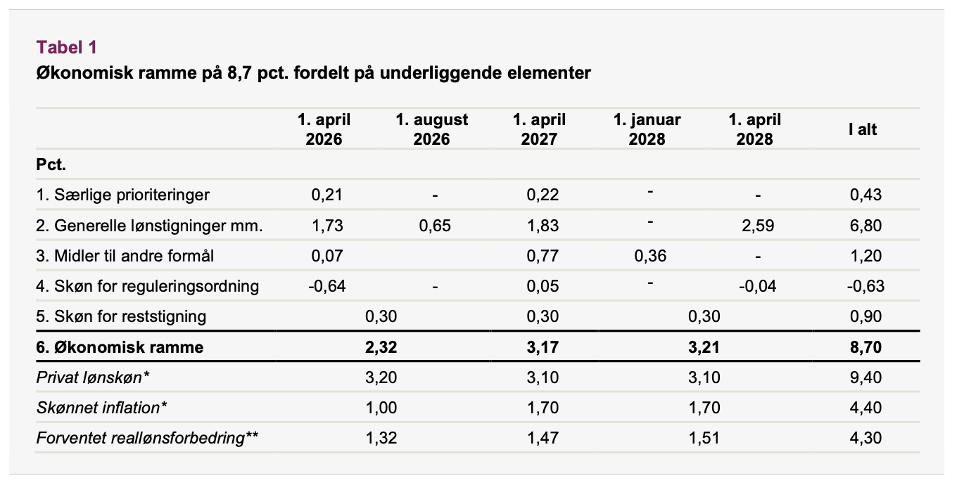 Der er afsat 6,8 pct. til den generelle lønstigning. Med en delvis negativ udmøntning af skøn for reguleringsordningen på -0,63 pct. og en styrkelse af den lokale løndannelse på 0,2 pct. (1. april 2027) betyder det, at den samlede lønramme i perioden 1. april 2026 – 31. marts 2029 er på ca. 6,37 pct.
